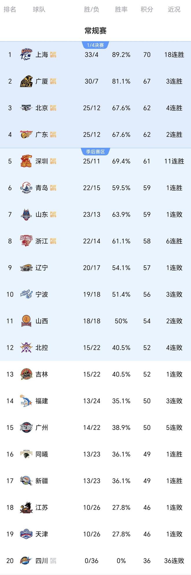 CBA疯狂一夜:上海18连胜,广东+北京造惨案,广厦逆转,排名如下